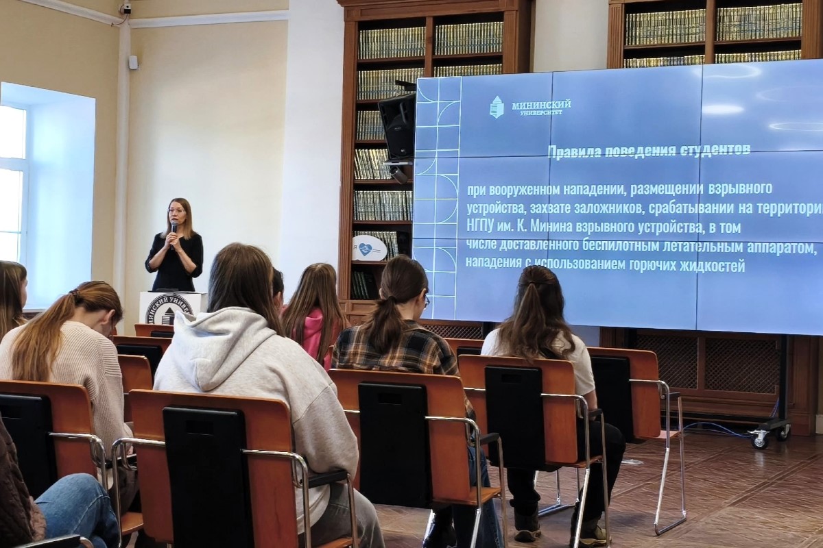 Сразу после церемонии со студентами прошла беседа по алгоритмам действий в ЧС: при вооруженном нападении, угрозе взрыва или атаке БПЛА. В Мининском университете такие занятия проходят регулярно — студенты изучают документы и отрабатывают навыки на учениях.
