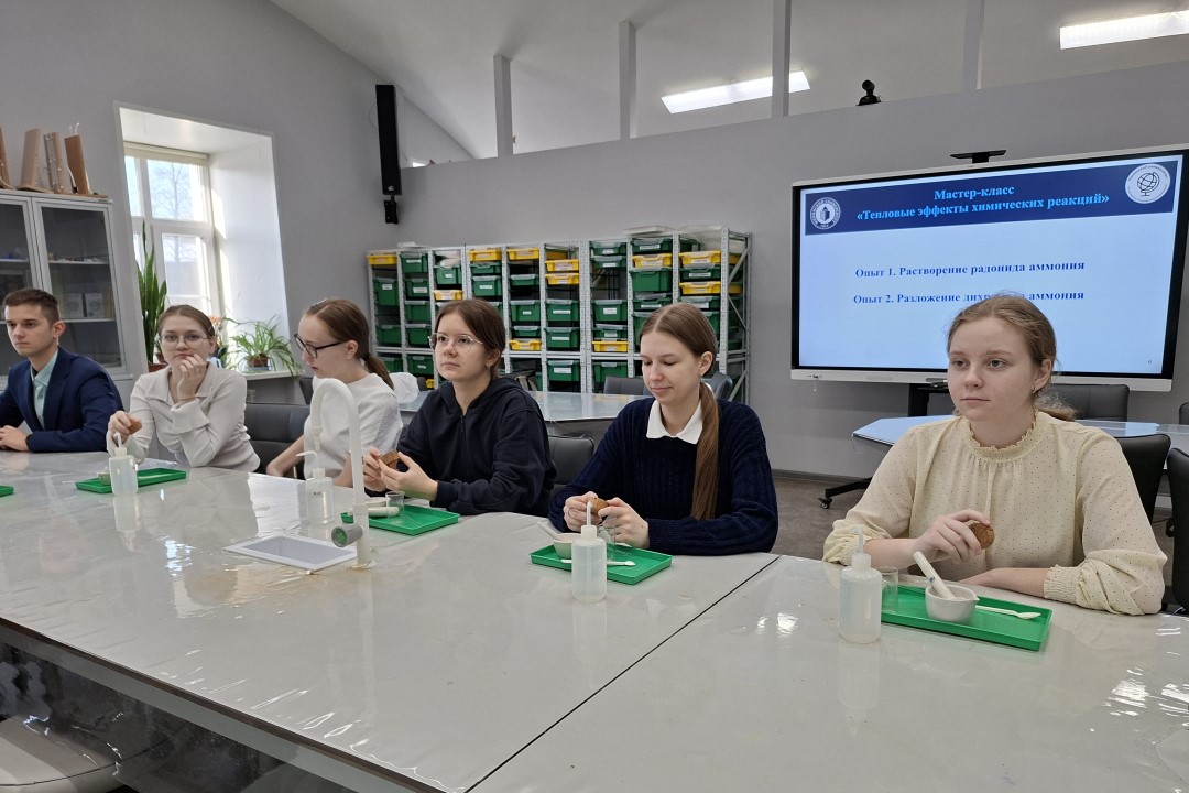 Практикумы продолжились на естественно-географическом факультете. Кандидат химических наук Наталья Пиманова на примере безопасных экспериментов объяснила 11-классникам гимназии № 13 природу экзотермических и эндотермических реакций. Школьники узнали, как тепловые процессы работают в быту — от систем отопления до охлаждающих пакетов из аптечки.