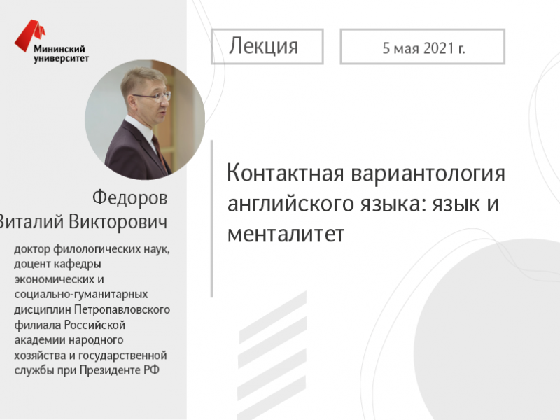 5 мая в Мининском университете для студентов состоится интерактивная лекция доктора филологических наук, доцента кафедры экономических и социально-гуманитарных дисциплин Петропавловского филиала Российской академии народного хозяйства и государственной службы при Президенте РФ «Контактная вариантология английского языка: язык и менталитет».