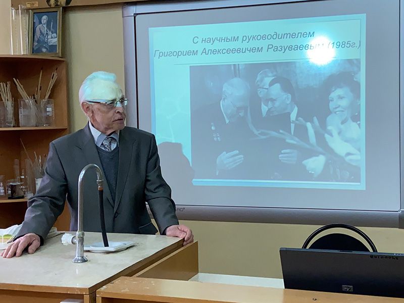 Встреча была посвящена воспоминаниям об академике Григории Разуваеве. В этом году отмечается 125 лет со дня его рождения. Сергей Жильцов был его учеником и защитил кандидатскую и докторскую диссертации по химии под его руководством совместно с Григорием Петуховым.